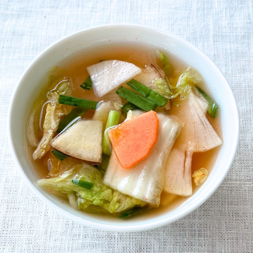 汁も野菜も味わう、辛さ控えめの伝統製法の水キムチ!