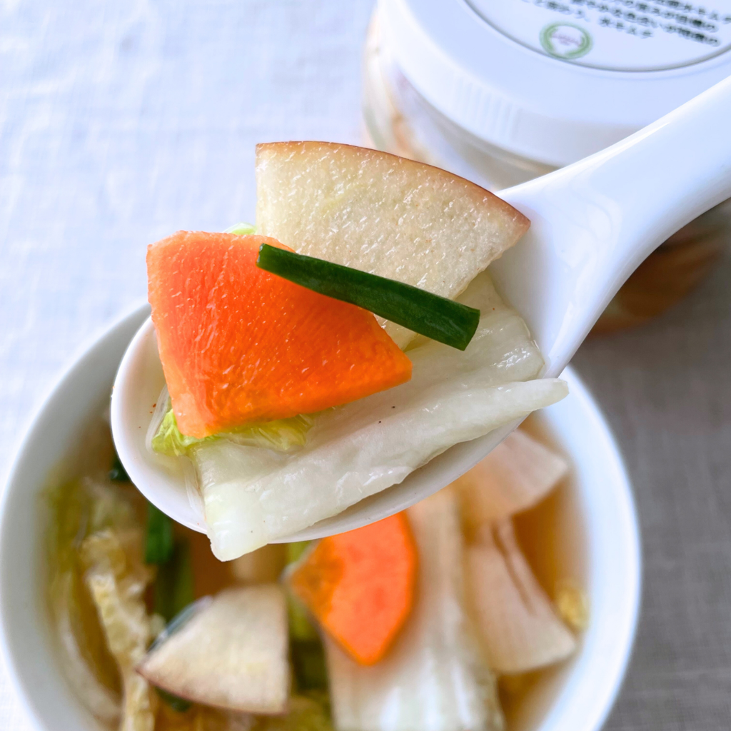 | 原材料名 | 白菜(国産)、大根(国産)、りんご(国産)、にら(国産)、人参(国産)、漬け原材料(砂糖、食塩、りんご酢、にんにく、生姜、唐辛子) |