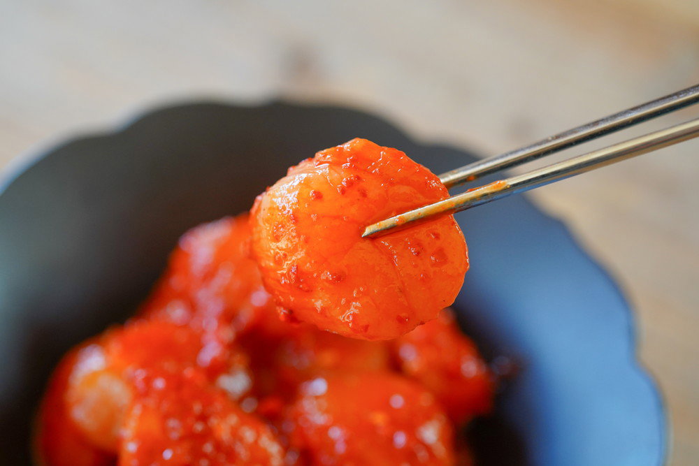 厳選した国産のホタテを、秘伝のヤンニョムで一粒一粒丁寧に漬けた「帆立キムチ」