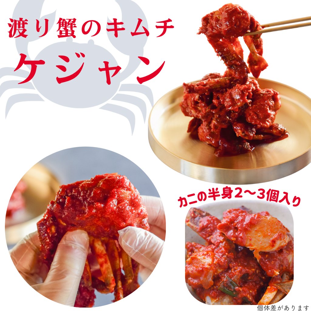カニの中で最も繊細な味を持つと言われる”渡り蟹”のとろける旨さと秘伝のヤンニョム(薬味)の風味と辛味が自慢の逸品です。通年食べたい!というお客様のリクエストや声にお応えし当社と直契約している渡り蟹業者と協力し水揚げした渡り蟹を当社の薬念(ヤンニョム)レシピで製造しさらに美味しくなったケジャンをお届けします。(ケは蟹、ジャンは醤のこと)