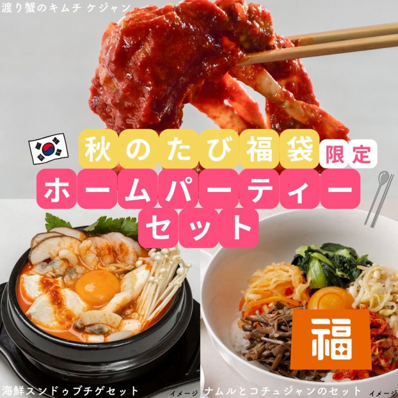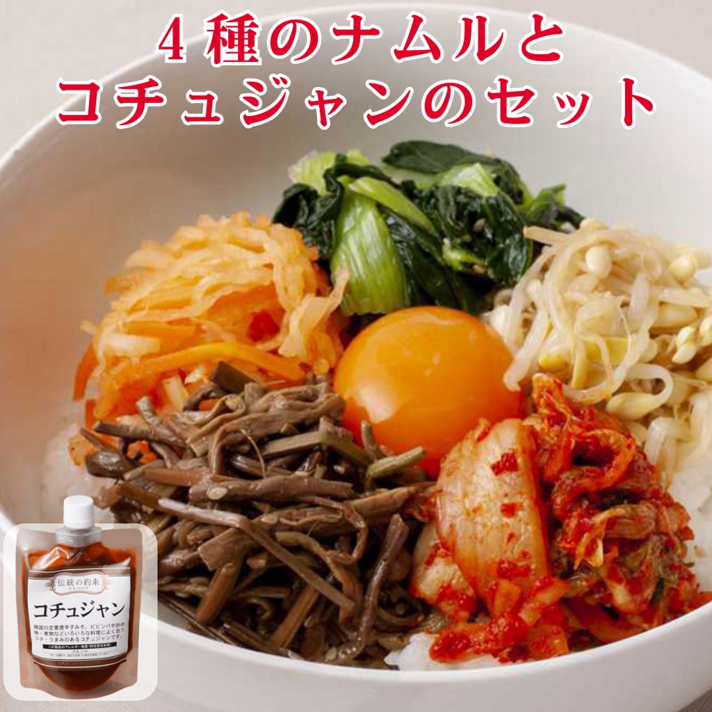 4種の彩りナムル:もやしナムル(大豆もやし(国産)、砂糖、ごま油、食塩、ごま/調味料(アミノ酸)、ぜんまいナムル(ぜんまい(中国)、焼肉タレ(醤油、砂糖、その他)、醸造調味料、砂糖、ごま油、大豆油、みりん、風味調味料、食塩、にんにく、ごま、胡椒/調味料(アミノ酸等)、酸味料、香料)、ほうれん草ナムル(ほうれん草(国産)、ごま油、砂糖、食塩、ごま、醤油、胡椒/調味料(アミノ酸)、大根ナムル(大根(国産)、醸造酢、砂糖、人参、唐辛子、食塩)、(一部に小麦・ごま・大豆・りんごを含む) コチュジャン:水飴(甘藷、馬鈴薯(国産))、味噌(大豆(遺伝子組み換えでないものを分別)を含む)、発酵調味料(液状ブドウ糖、アルコール、米、本みりん、食塩、米麹)、砂糖、唐辛子(中国)、米酢、食塩、スルメ粉(いかを含む)、麦芽、きな粉(大豆(国産)を含む)、かつお節粉/酒精 海鮮スンドゥブチゲセット:スンドゥブチゲスープ:味噌(国内製造)、キムチの素(小麦・大豆・ごまを含む)、ねぎ、牛骨エキス、にら、韓国味噌、コチュジャン(いかを含む)、砂糖、醸造調味料、みりん、にんにく、醤油、風味調味料、牛肉味だしの素(乳成分を含む)、胡椒 / 調味料(アミノ酸等)、酸味料、香料 海鮮具材:えび、いか、あさり 手仕込み渡り蟹のキムチ ケジャン :わたりがに、コチュジャン、水あめ、にんにく、醤油、唐辛子、砂糖、オリゴ糖、玉ねぎ、ごま油、生姜、みりん、レモン果汁、胡椒、食塩、/調味料(アミノ酸等)、酒精、パプリカ抽出色素、甘味料(ステビア)、一部にかに・大豆・小麦・ごまを含む) |